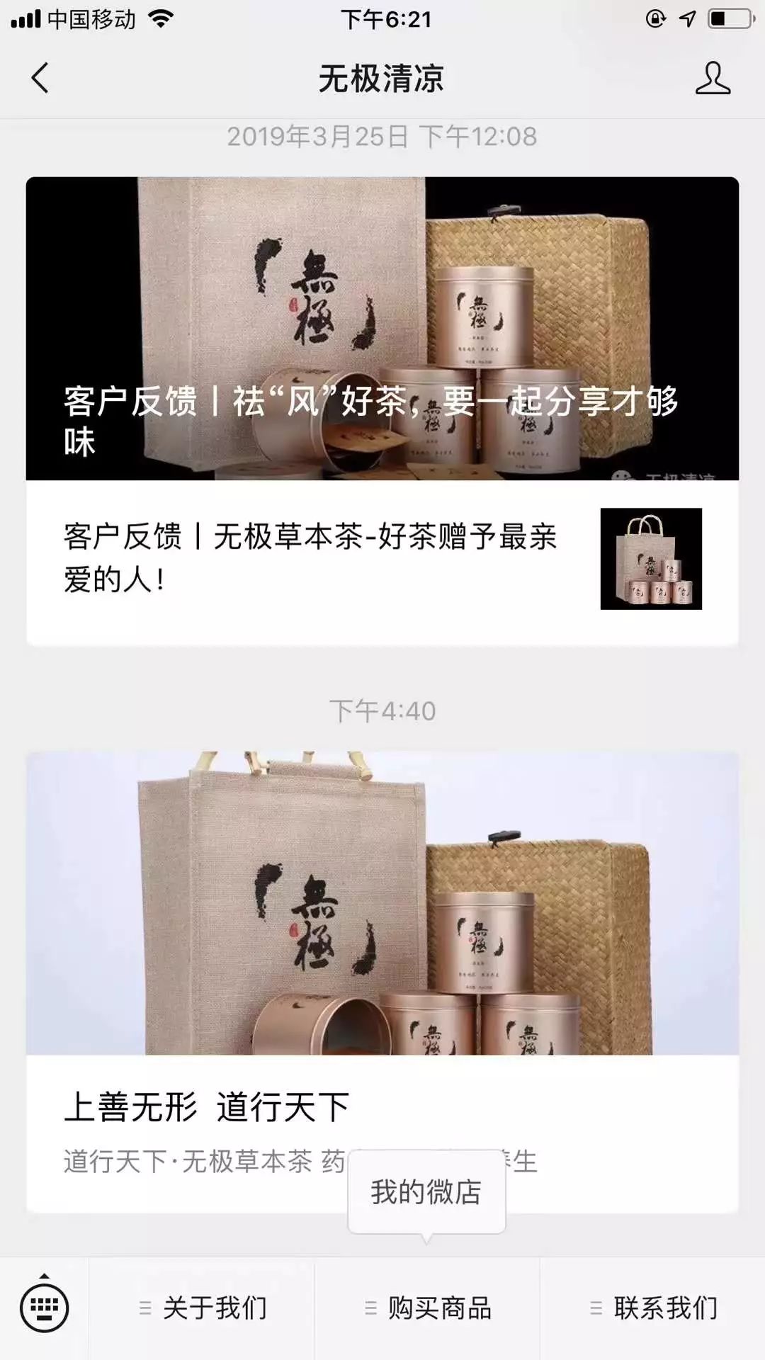 點(diǎn)開“無極清涼”微信公眾號(hào)聊天頁(yè)面,點(diǎn)擊左下角菜單目錄【關(guān)于我們】,選中【我的微店】